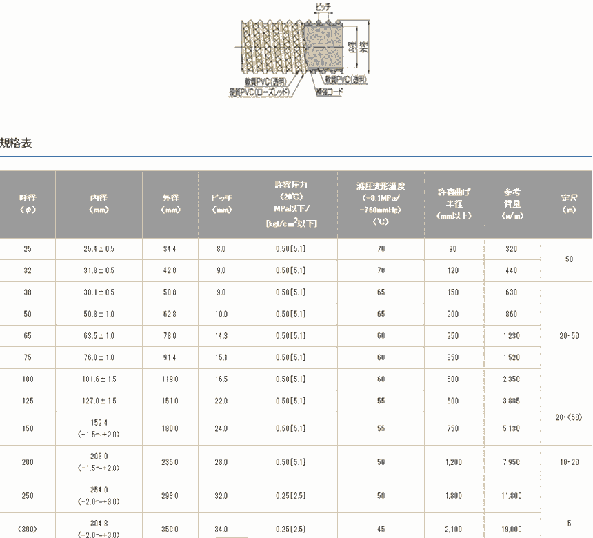 使用流体/用途 | 水 | カットサービス対応 | あり | 特長 | 耐圧性 / 柔軟性 / サクション |