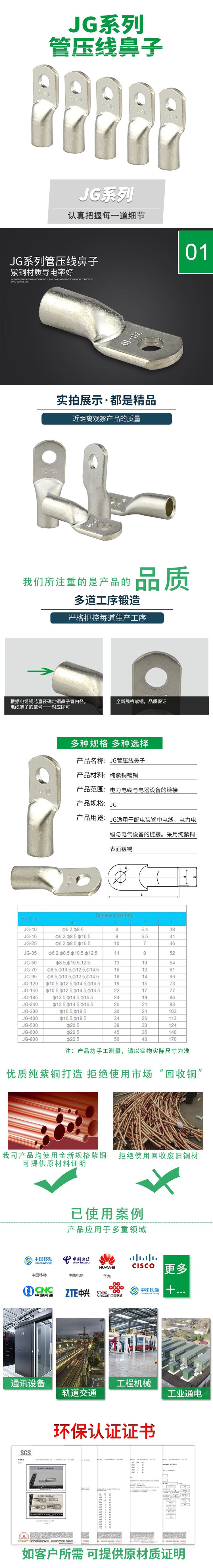 JG管压铜鼻子 管制线鼻子 接线端子 ,适用于配电装置中导体与电气设备间的连接。表层镀锡,增加导电性,抗氧化。 PS:实物拍摄,灯光问题,实物光泽美观。具体以实物为准。外通讯设备、新能源项目、光伏项目等领域。我们的运营模式是 工厂------------销售----------- 消费者 产品直接垂直到消费者手里 省去中间商 ,供应商,零售店 的层层加价