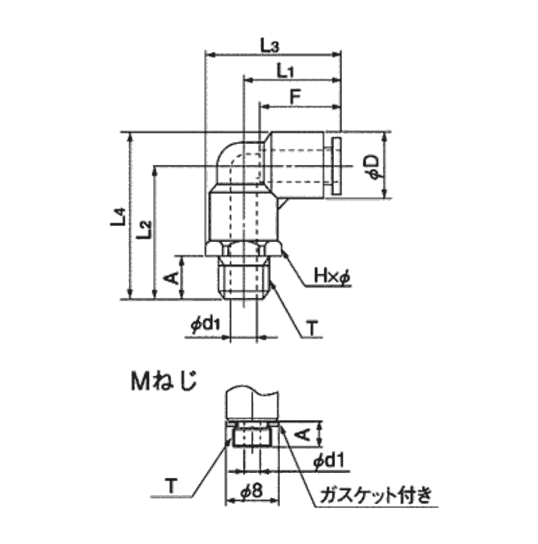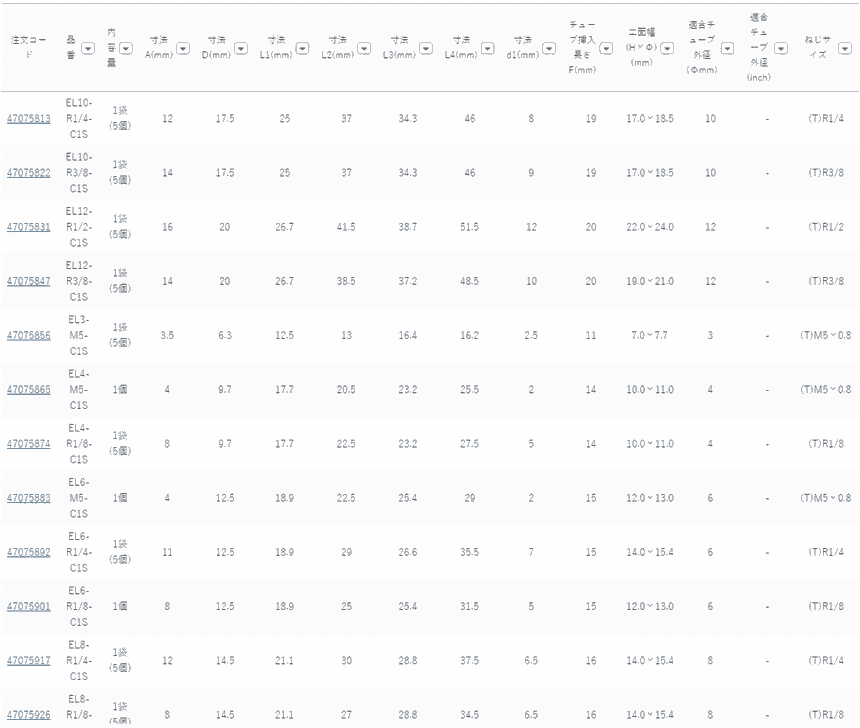 形状90°エルボ 使用流体空気(クリーンエア)、水(純水) 高使用圧力(MPa)0.7 (at20℃) 使用温度範囲(℃)(空気)-20℃~+80℃、(水)0℃~+80℃