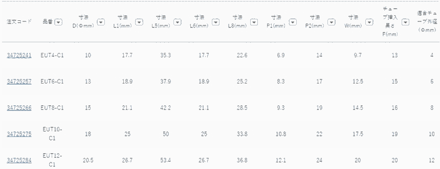 寸法d2(Φmm)4.2 形状ユニオンティー 使用流体空気(クリーンエア)、水(純水) 高使用圧力(MPa)0.7 材質(本体)特殊ポリプロピレン樹脂 使用温度範囲(℃)(空気(クリーンエア))-20~80、(水(純水))0~80 適合チューブPL、PN、TA、TP 材質(Oリング)EPDM 負圧性能(kPa)-99.975 内容量1個