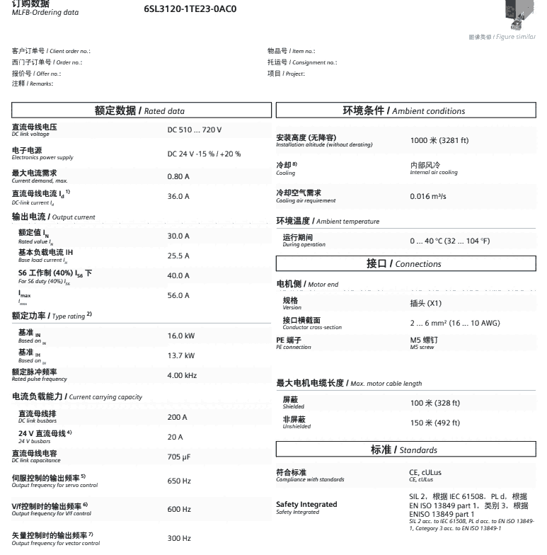 SINAMICS S120 单电机模块 输入:600V DC 输出:3AC 400V,30A 结构形式:书本型 C 型 内部风冷 优化的脉冲图形和 支持扩展 安全集成功能 包含 DRIVE-CLiQ 电缆