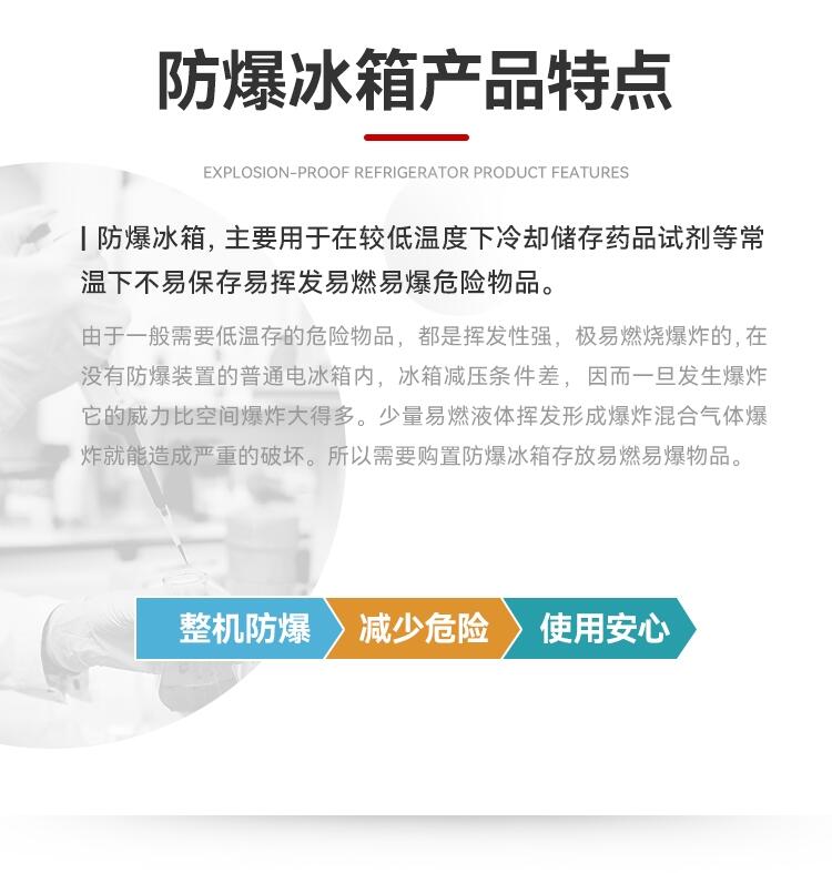 本产品防爆性能可靠、外形美观、操作简便。可广泛用于石油、化学化工、医药、航空航天、实验室、储藏、军事等部门,具有IIC级、温度组别为T4/T6的爆炸性气体混合物的1区、2区(或0区)内部危险性场所,用于在较低温度下冷却储存药品试剂等常温下不易保存易挥发易燃易爆危险物品。适合保存易燃易爆化学危险品,包括在受热、摩擦、震动、遇潮、化学反应等情况下发生燃烧、爆炸等恶性事故的化学物品,燃烧爆炸为主要特性的压缩气体、液化气体、易爆液体、易燃固体、自燃物品、遇湿易燃物品、氧化剂、有机过氧化剂、毒害品、腐蚀品中部分易燃易爆化学物品。