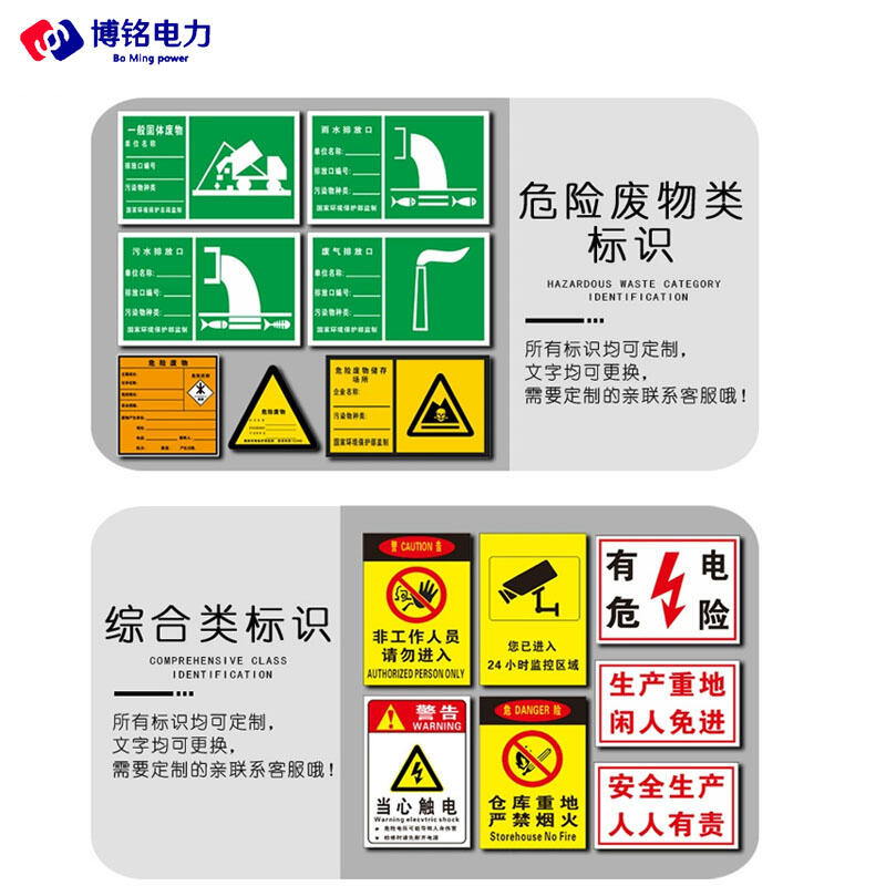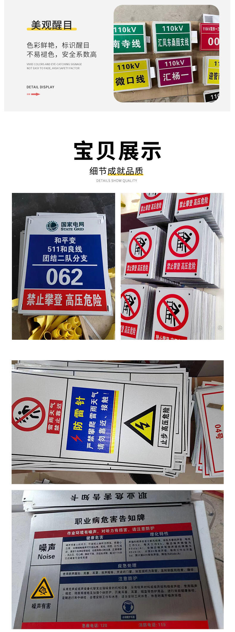 河北博铭电力生产安全标识牌耐酸碱、抗腐蚀,在野外经风吹雨打,不会褪色。设置在厂矿、建筑工地、电力设施、交通运输等应注意安全的场所,向人们敲响安全警钟,是企事业单位做好安全管理,安全生产知识宣传工作的得力助手。