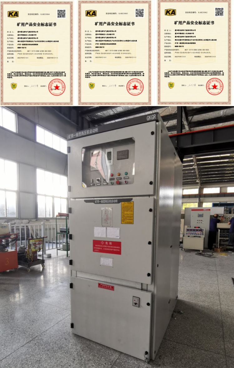 GKGR矿用一般型高压软起动柜 一体柜主要针对矿山行业研发制造的一种高压电机软起动装置,通过矿安KA认证,主要用于各种矿山企业中的矿用风机、水泵、破碎机等,GKGR起动柜可以降低电机的起动冲击电流,减少对电网和电机自身的冲击。同时也减少了对连在电机上机械负载装置的机械冲击,以延长设备的使用寿命,减少故障和停机检测时间。