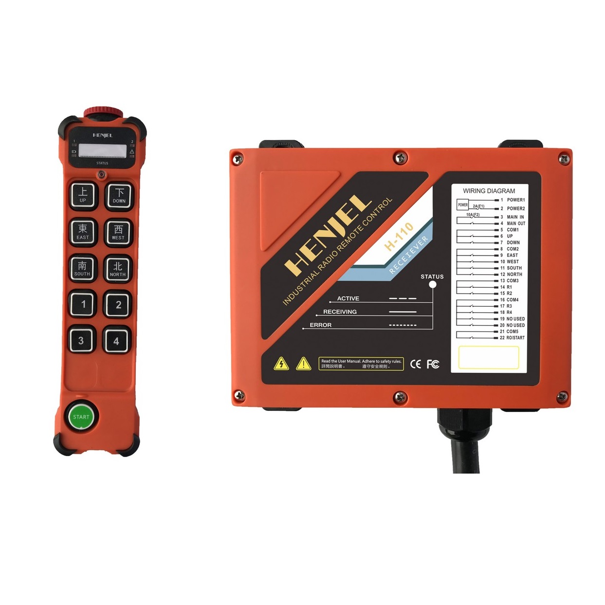H110型工业无线遥控器,拥有10只功能按键、独立的启动按钮和欧规蘑菇头急停。