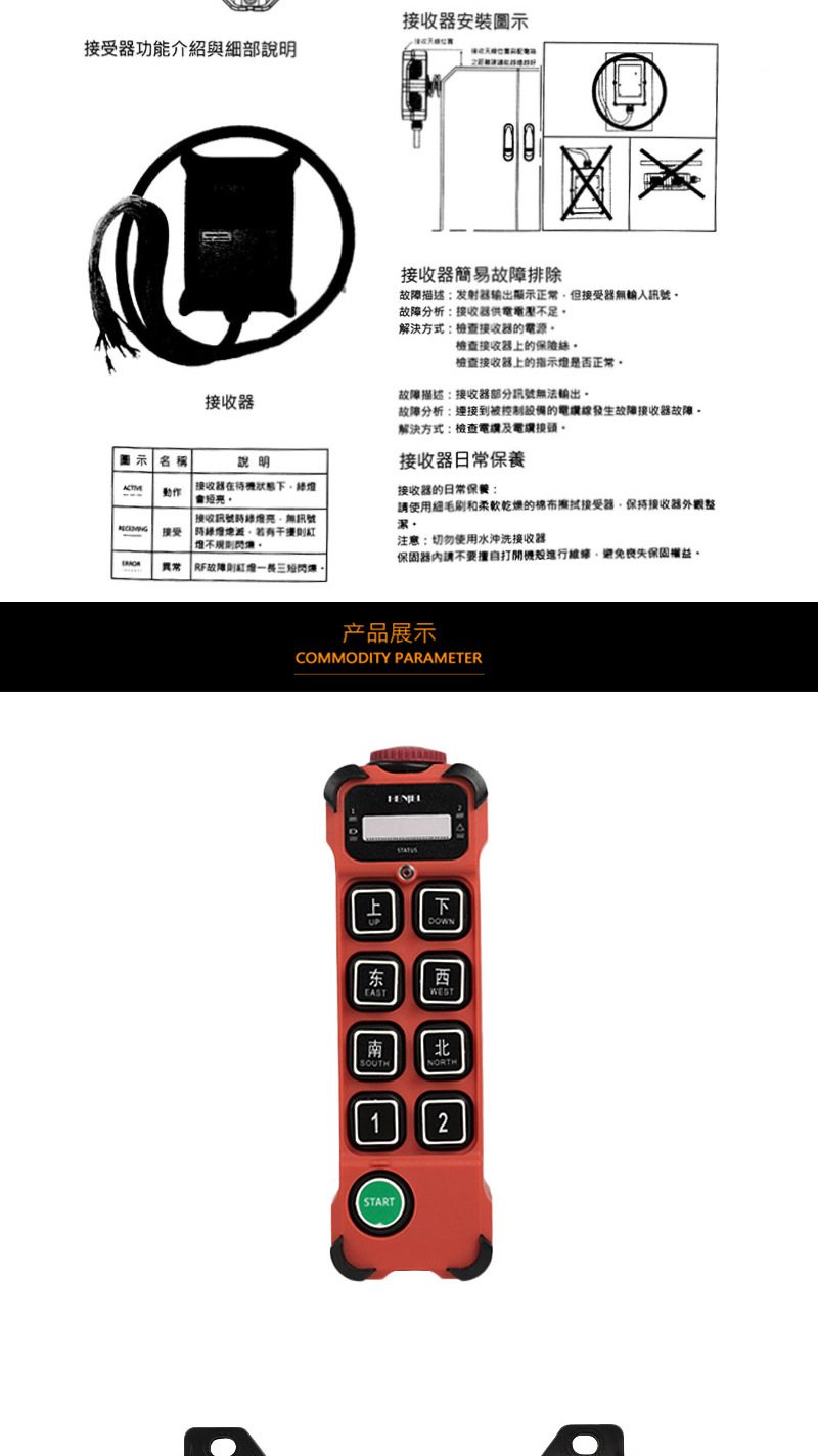遥控器手柄纤巧,做工细致,线条流畅,工业级玻纤增强型工程塑料外壳,适应绝大多数工业环境,八个角均配有防摔减震橡胶护角。