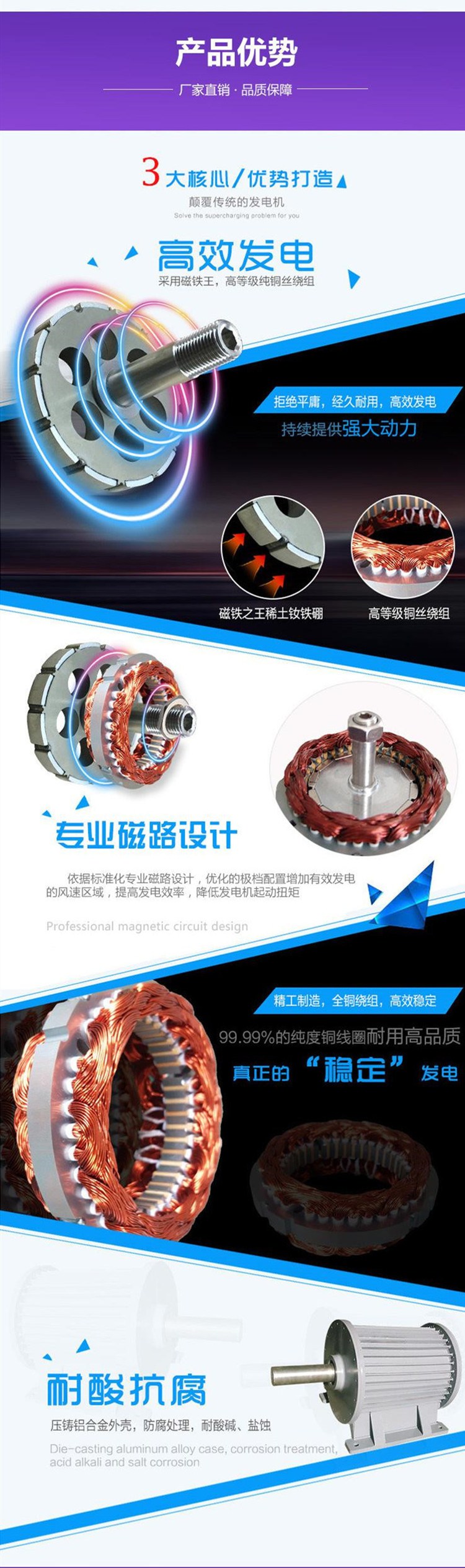 五:无炭刷、无励磁绕组,无励磁控制箱,结构简单,不产生火花.可靠性高,防护等级:IP54,使用寿命长。