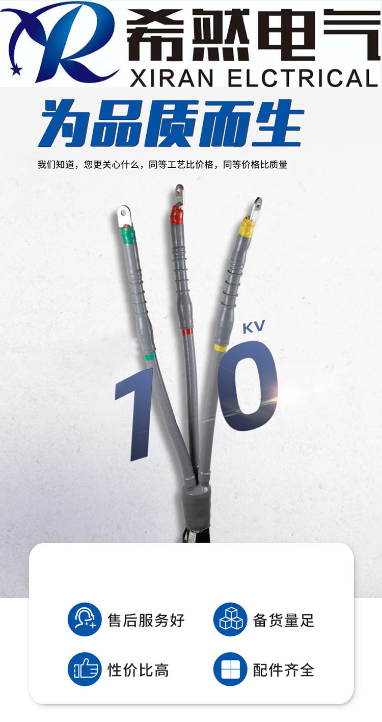 全冷缩电力电缆附件的特点 1·绝缘可靠“ 冷缩附件采用硅胶材料,绝缘硅胶具有绝缘电气性能优越;抗漏电痕、抗电蚀;耐高低温、耐恶劣环境;硅胶材料具有憎水性,可增加电爬距。 2·结构合理 3·密封性可靠 冷缩产品安装后对电缆保持径向压力,因此,对防潮、防湿效果好; 冷缩产品安装过程中,使用了密封胶、防水胶带、密封管进一步提高了密封效果。 4·运用广泛 硅橡胶具有耐恶劣环境,使其使用各种不同环境下运行; 产品安装过程中不用明火,能适用石化、化工等易燃易爆场所。 5·安装简便 产品都已在工厂内成型,参照安装说明书就可准确操作; 产品安装过程中不用明火,不用专业工具,便于野外使用; 产品安装方便、快捷,便于电力抢修。