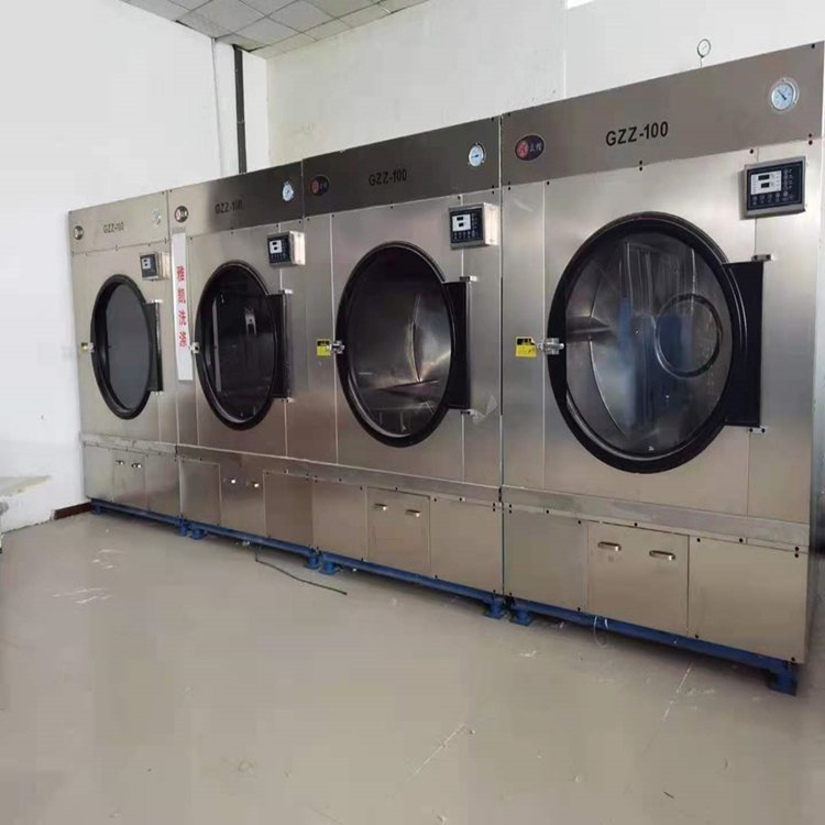 烘干机:按容量大小分为:30kg、50kg、100kg、120kg、150kg烘干机。该机为箱柜式结构,通过顶置散热器,由底部抽风机,将热量均匀散发至箱体内部,滚筒作正反转运转,使织物均匀受热,湿气排出机外,达到烘干效果。该机由内置不锈钢滚筒、散热器、焊接外壳、电机、抽风机、电器部件、传动部件等组成。结构合理、效率高、噪音低、安全可靠。烘干后的织布,手感膨松柔软,是布草、织物的理想烘干设备。