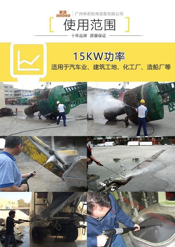 君道PU350超高压清洗机,工作压力350公斤,水流量22升每分钟,采用三陶瓷柱塞曲轴泵,低速电机,机身紧凑四脚轮装配移动轻便。可用于铸件清砂 。