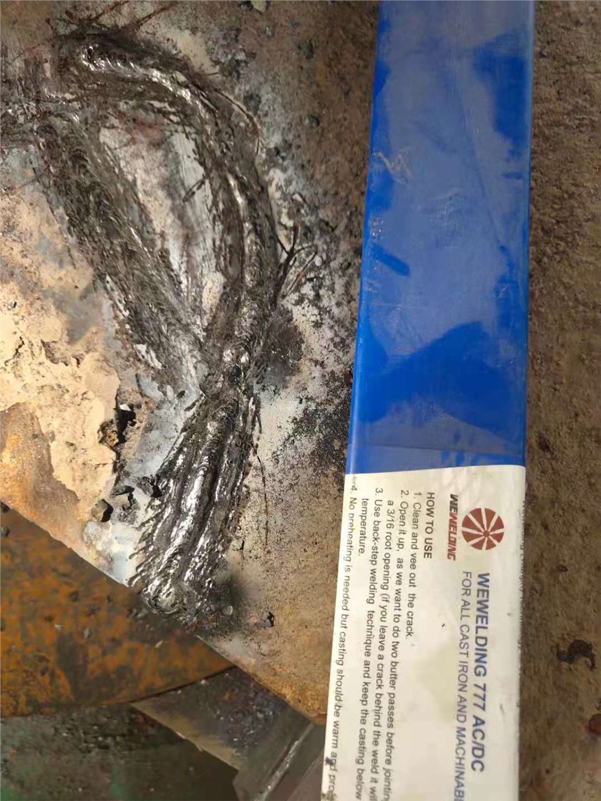7、特别注意:铸铁焊接相对比较挑,选择焊材不当或者工艺不妥,很容易造成工件开裂,裂纹延展,甚至不可修复,在没确定焊接工艺前,建议不要拿着工件用未知的焊条做焊接实验。