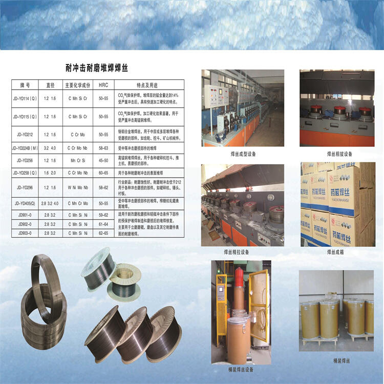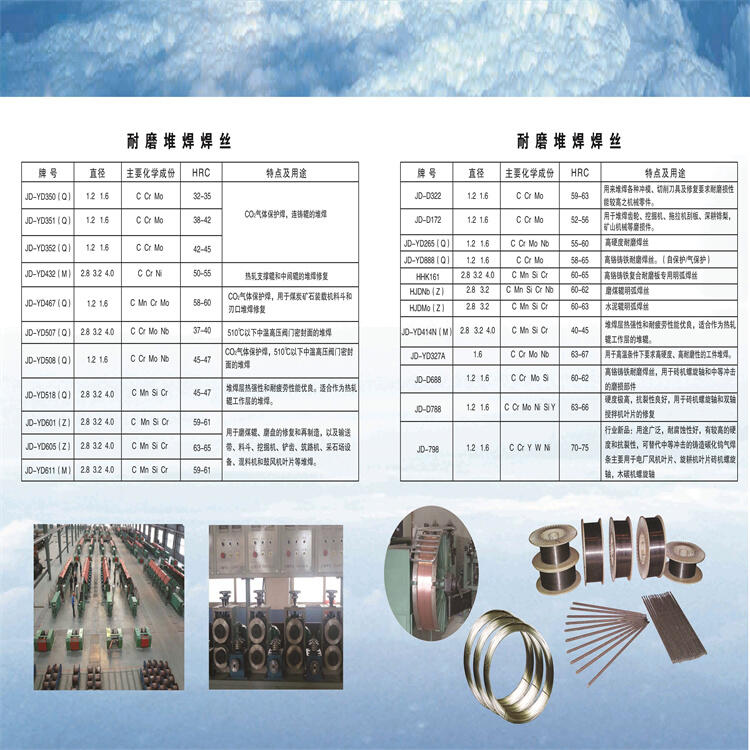 YD517 耐磨焊丝说明:YD517是CO2气体保护的高铬型耐磨焊丝。堆焊时电弧稳定、脱渣容易。YD517焊条交直流两用。