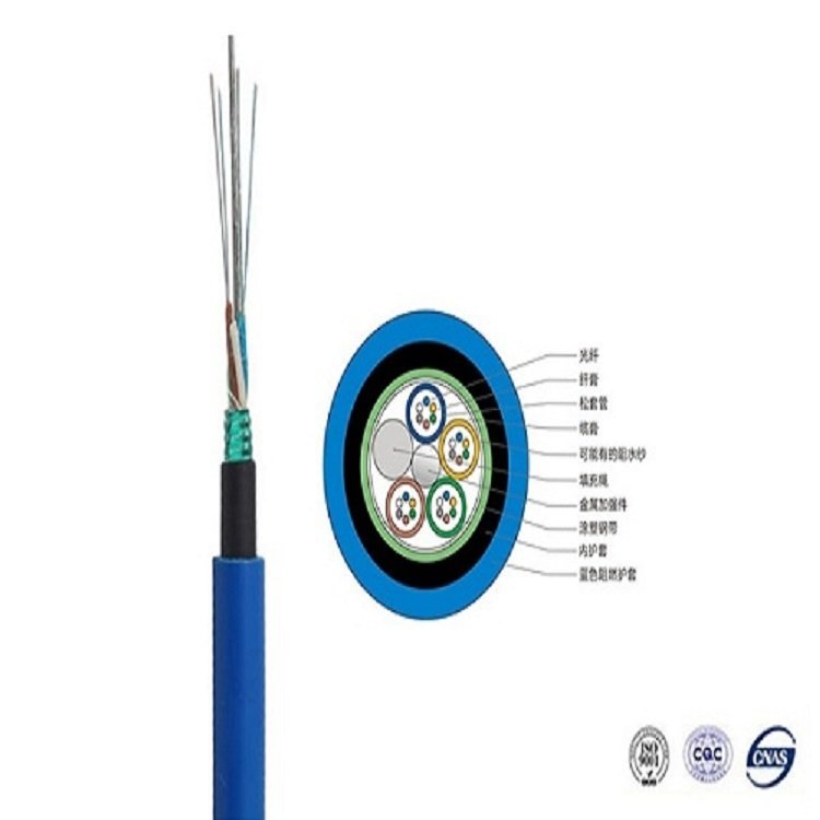 矿用阻燃光缆的结构是将单模或多模光纤套入由高模量的塑料做成的松套管中,套管内填充阻水化合 物。 缆芯的中心是一根磷化钢丝或挤上聚乙烯的钢丝绳,松套管(或填充绳及信号线)围绕中心加强芯绞合成紧凑和圆形的缆芯,缆芯内的缝隙充以阻水填充物钢-聚乙烯粘结内护套后,蓝色阻燃PVC护套成缆.