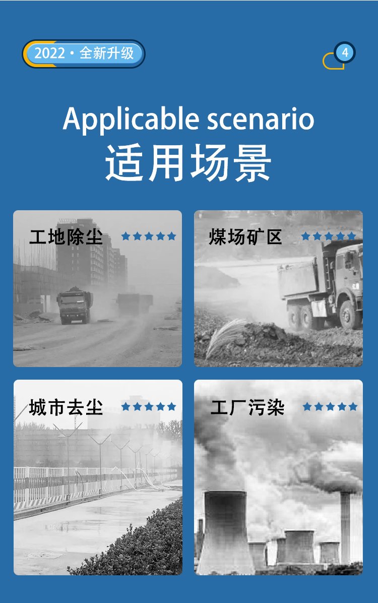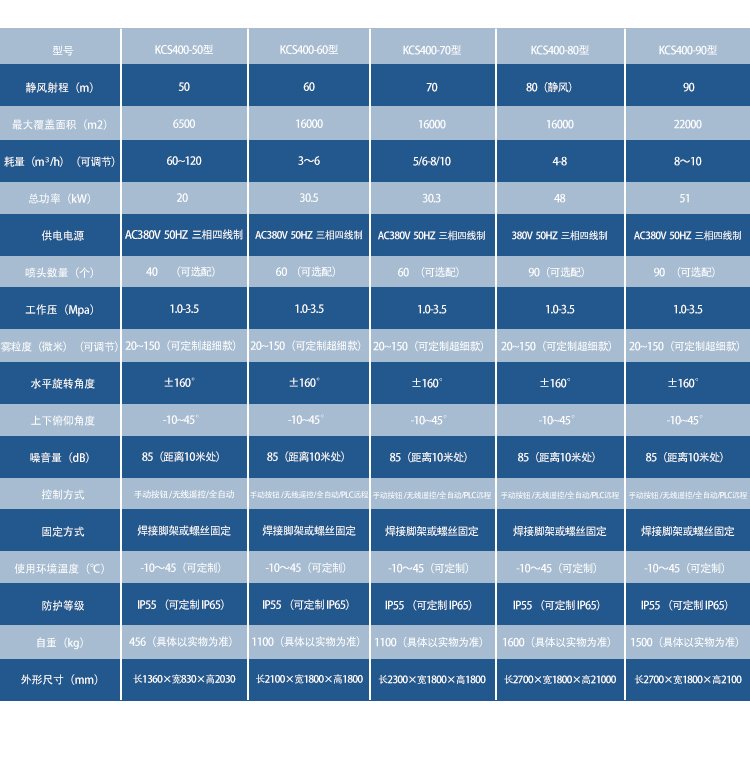 雾粒度(μm)(可调节) | 20~150(可定制超细款)(可定制干雾雾炮)(可定制双流体雾炮) | ||