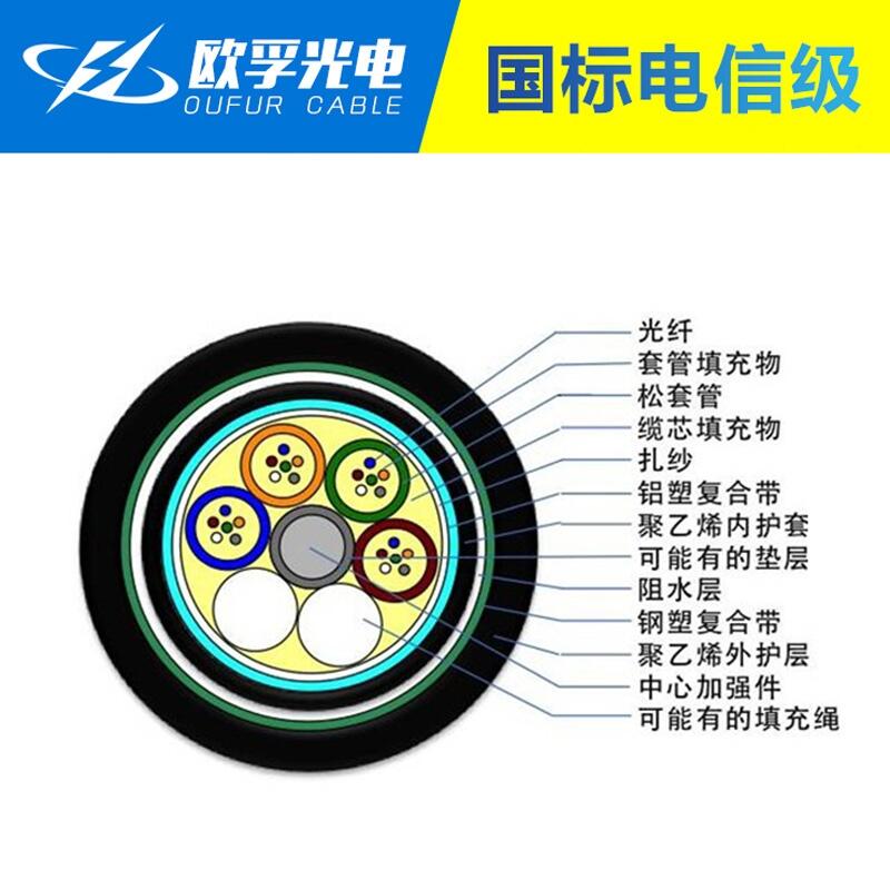光缆采用松套层绞式结构,光纤套入由高模量聚酯材料制成的松套管中,套管内填充防水化合物。松套管 (和填充绳)围绕非金属中心加强芯(磷化钢丝)绞合成紧凑的缆芯,缆芯内的缝隙充以阻水油膏。涂塑铝带(APL)纵包后挤一层聚乙烯内护套 (PE)内护套,然后加固一层阻水层,最后双面涂塑钢带(PSP)纵包后挤制聚乙烯护套成缆。