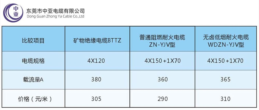 在同样使用环境下进行价格比较:电缆均传输相同的载流量;矿物绝缘电缆铜护套替代接地线芯。