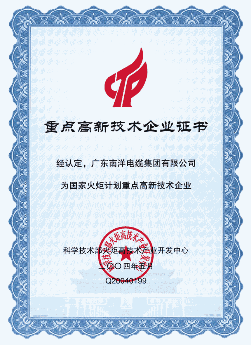 公司是通过ISO质量管理体系、环境管理体系、职业健康安全管理体系、测量管理体系认证的企业,是全国电线电缆标准化技术委员会委员单位、广东省电线电缆行业协会会长单位。35kV及以下电缆产品获得全国工业产品生产许可证,电线产品通过中国质量认证中心CCC认证, 6~35kV、110kV、220kV、500kV电缆通过产品鉴定,220kV及500kV电缆系统通过预鉴定试验和荷兰凯马(KEMA)认证,500kV电缆系统填补了华南地区空白。0.6/1kV、6~35kV、110kV、220kV电缆产品均被评为广东省名牌产品、广东省高新技术产品。公司连续多年被评为“守合同重信用企业”单位,银行信用等级为AAA级;拥有广东省工程技术研究开发中心、省级企业技术中心、广东省超高压电缆工程技术研究中心,拥有多项专利并多次参与国家标准及行业标准的制定,不断创新开发新产品。
