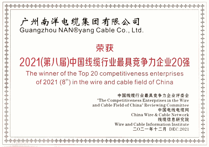 广州南洋电缆集团有限公司(原名:广州南洋电缆有限公司)成立于2001年,实缴注册资本7.708亿元,净资产12亿多元,总资产20亿多元,近三年含税销售额近150亿元,三年共计向国家缴纳税收近2亿元。NAN南牌电缆创于1985年, 至今已有30多年历史。公司生产基地总面积25万平方米,年生产能力70亿元。公司是高新技术企业,连续多年荣获广东线缆行业竞争力企业20强第一名、荣获中国线缆行业竞争力企业20强,是广东制造业100强的企业,是华南地区专业研发制造500kV、220kV、110kV、35kV及以下交联电力电缆、低压电线电缆以及预分支电缆、辐照电缆、矿物绝缘电缆、电动汽车充电电缆、70年使用寿命环保电线等各类电缆的龙头企业。