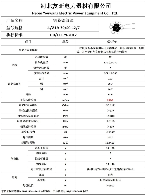二、 产品执行标准:GB/T1179-2017 《圆线同心绞架空导线》;