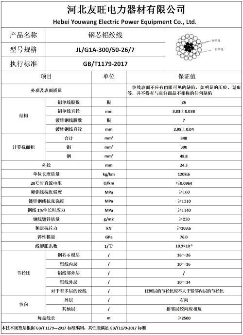 四、国标钢芯铝绞线JL/G1A300/50现货供应产品基本参数及样本图片: