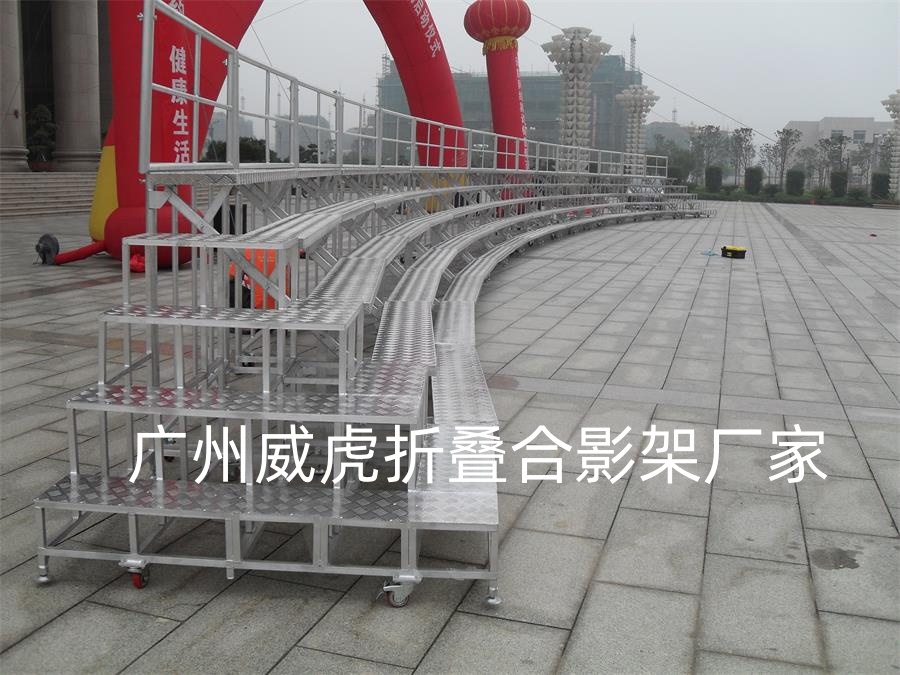 威虎舞台专业生产铝合金折叠合唱台,合唱台多用于人多,集合度较高的场合,例如,合唱,合影等。踏步可木板加地毯.贴面木板加包边.铝合金板面,踏步有三层.四层.五层.六层可选,有带脚轮和不带脚轮。单个基本宽度1.2米、1.5米、1.6米,1.8米,单个最宽为2米,可以多个组合。长宽高可根据客户的需求来订做,需要多少层就可做多少层,结构牢固,价格适中,外观精美,深受消费者的认同。折叠式合唱台架,轻便牢固,台面为铝合金板面(防滑), 台支撑铝合金结构,带脚轮方便移动,台阶底部加装防磨固垫,保护台阶的同时增加安全系数。配件大量采用低碳钢精密铸造件与合金钢热处理件。受力螺栓均为高强度合金螺栓。合唱台的靠栏可拆装.踏步可折叠起来,节省90%空间,易存储,运输方便。广泛用于学校、单位、文艺演出、集体照相、少年宫、各大企业事业单位。