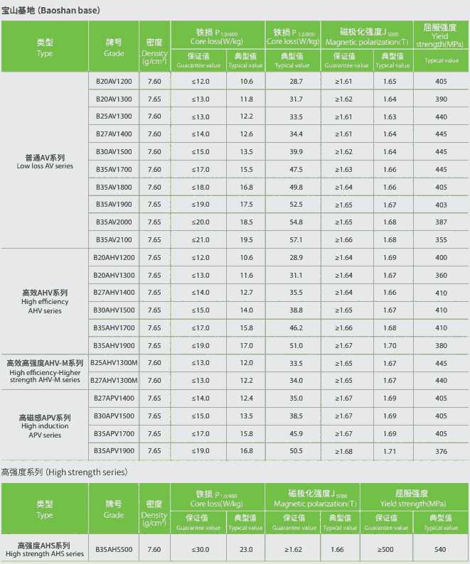 宝山基地新能源汽车驱动电机用硅钢B20AV1200 B20AV1300 B25AV1300 B27AV1400 B30AV1500 B35AV1700 B35AV1900 B35AV2000 B35AV2100 B20AHV1200 B20AHV1300 B27AHV1400 B30AHV1500 B35AHV1700 B35AHV1900 B25AHV1300M B27AHV1300M B27APV1400 B30APV1500 B35APV1700 B35APV1900 B35AHS500等牌号。