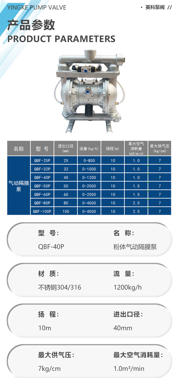 英科牌自吸式304不锈钢颜料水泥石墨滑石粉气动粉体隔膜泵QBF-40P