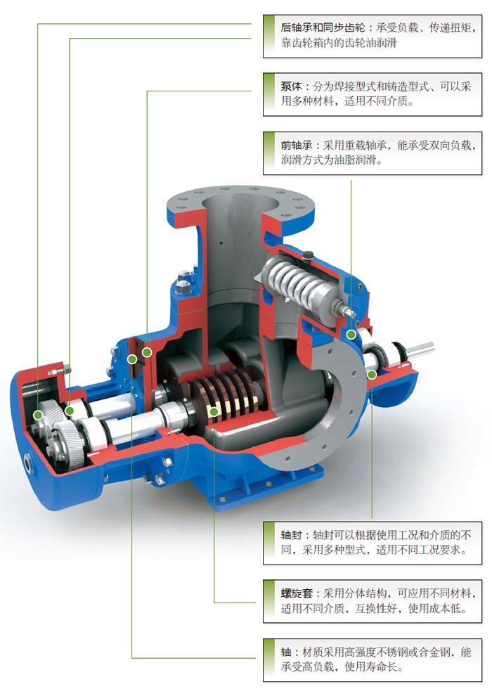 双螺杆泵有密封式和不密封式两种类型,按介质从一端还是 从两端进入啮合空间,双螺杆又被分为双吸式和单吸式两种结构。双螺杆泵是外啮合的螺杆泵,它利用相互啮合,互不接触的两根螺杆来抽送液体。双螺杆泵为一种双吸式非密闭的双螺杆泵。一端伸出泵外的主动螺杆由原动机驱动。主动螺杆与从动螺杆具有不同旋向的螺纹。螺杆与泵体紧密贴合。从动螺杆是通过同步齿轮由主动螺杆带动的。