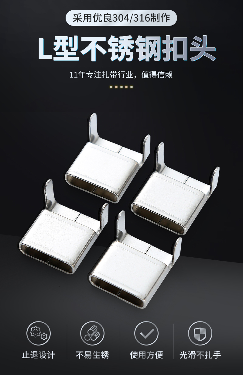 L型不锈钢扎扣为经济型捆扎扣,捆扎标牌,电缆,管道保温等,用于舶业,矿业,石油业,化工管道行业以及建设等