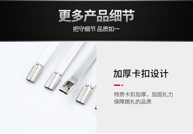 2.具有各种规格类型的扎扣可选,配合宽度为6-20MM不锈钢带,能适应各种形状工程任务的被捆扎物体;