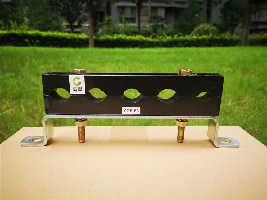 推荐客户使用YGF-52,字母YG代表品牌远固的缩写,F是指50-150平方的电缆,远固小孔五孔电缆固定夹,可同时固定4根50-150平方1根25-70平方的电缆,用直径表示为4根15-20mm和1根10-15mm的电缆,客户的70平方电缆正好在YGF-52电缆固定夹的范围内。