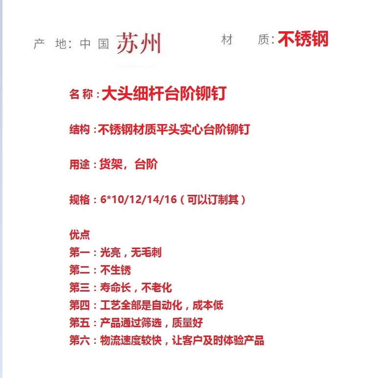 大头细杆铆钉 不锈钢冷墩台阶铆钉 平头实心台阶铆钉