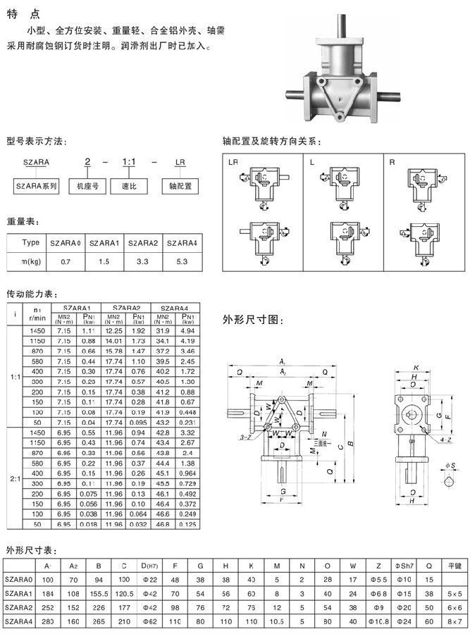 ARA伞齿轮齿轮 转向箱 技术参数: 功 率:0.018KW~4.94KW 转 矩:6.95~46.8Nm 传动比:1:1,2:1 齿轮:齿轮采用高纯净度合金刚20CrMnTiH渗碳淬火,及研磨而成; 转向箱机壳采用铝合金材料; 主轴:轴类采用合金刚调质、高悬重负荷能力; 轴承:配备重负荷能力的轴承; 油封:双封唇片的油封、兼具防尘及防漏油的能力; 润滑:适当的润滑油使用,可以发挥转向机的效率,并提高其运转的寿命。 a. 初期使用二周或100-200小时,为初摩耗期,这之间可能有少许金属摩耗粉粒,请务必清洁内部,并换新润滑油。 b.长期使用时,每半年-一年或1000-2000小时更换一次润滑油。