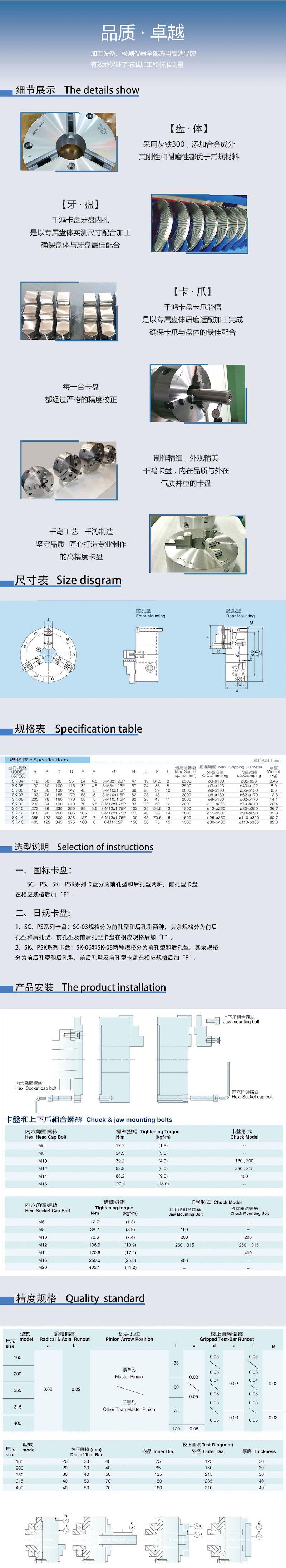 千鸿日规SK-08强力型高品质高精度三爪卡盘,千岛工艺,千鸿制造,专业级高精度手动三爪卡盘,每一道工序都精益求精,每一台卡盘都匠心制作。千鸿卡盘生产制造所用加工设备和检测仪器全部选用高端品牌,这是能生产出高精度手动卡盘的重要保障。