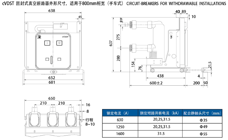 5、系列齐全。cVDST真空断路器具有完整的规格系列和外形尺寸,电气参数高达5000A、40kA,适应各种市场的要求.