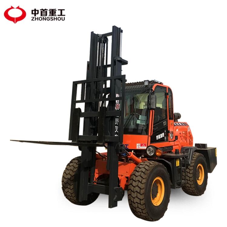 越野叉车的离地间隙,的越野轮胎。前桥带滑差速装置的四轮驱动。使发动机与变速箱之间设计的紧凑。能够在恶劣的地区如崎岖地形,沙地或泥地上作业。中重工3越野叉车采用深花纹、大宽度的越野轮胎,在建筑工地、农场等路面泥泞的工况下能够良好的抓地力、滑性、稳定性