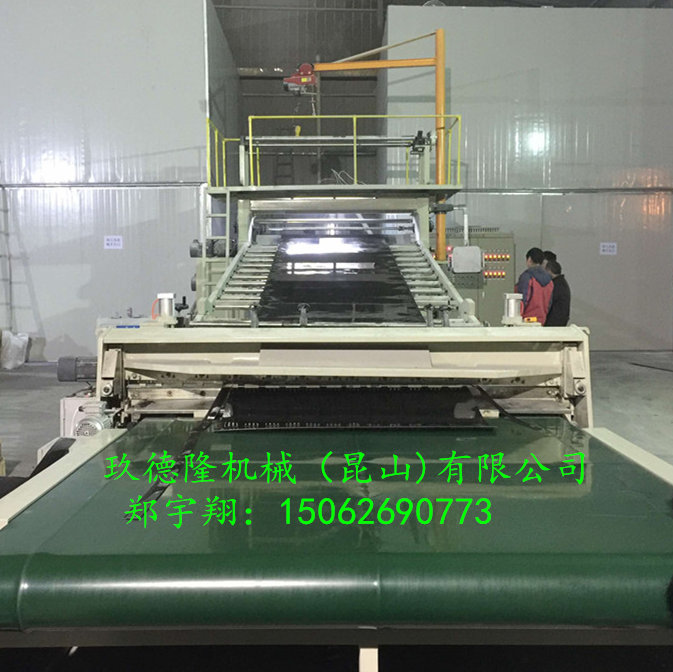 :生产工艺:密炼机——自动提升机——锥双喂料机——单(双)螺杆挤出机——液压自动换网装置——片材挤出模具----三辊压光机-----双工位放卷装置---—托架冷却-----电晕处理机装置------输送带------在线切割装置-----在线收卷
