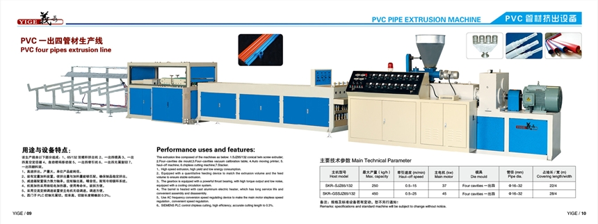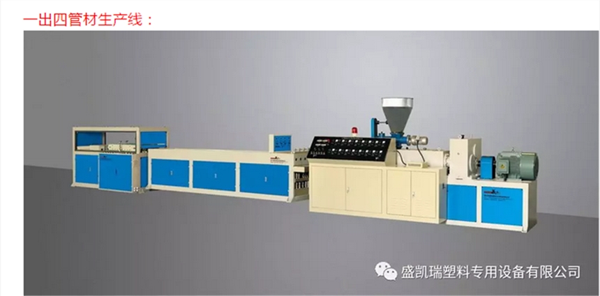 一出四管材挤出生产线即一模产出四条线管,在保证产品质量前提下,该设备在极大程度上降低了设备投入成本,厂房投入成本和生产投入成本,大大提高产量,减少生产时间。