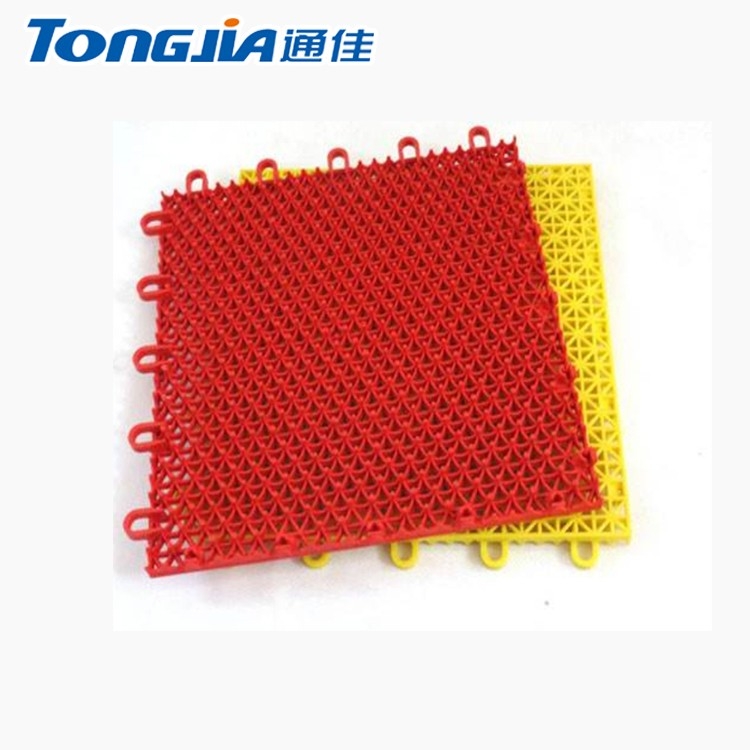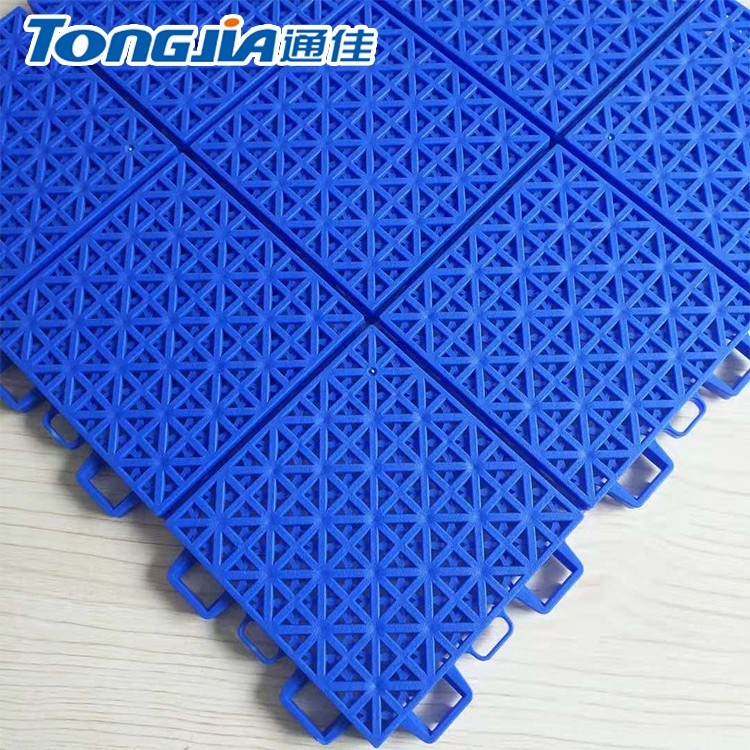悬浮式拼装地板采用成熟的高强度聚丙烯环保材料,有效解决地板热胀冷缩问题的同时还具有稳定的表面摩擦,抗紫外线添加剂被加入到每一块地板中,能够保障地板在长期受日光照射中不褪色,悬浮式的结构设计加上坚固的加强型支撑脚结构,创造卓越的垂直的减震效果,防滑的表面可有效防止运动损伤,良好的球回弹性能和球速保证了地板卓越的运动性能,适于生产用于铺装理想的高性能篮球场、网球场、五人足球场、轮滑球场、乒乓球场以及排球、羽毛球等多功能球场。