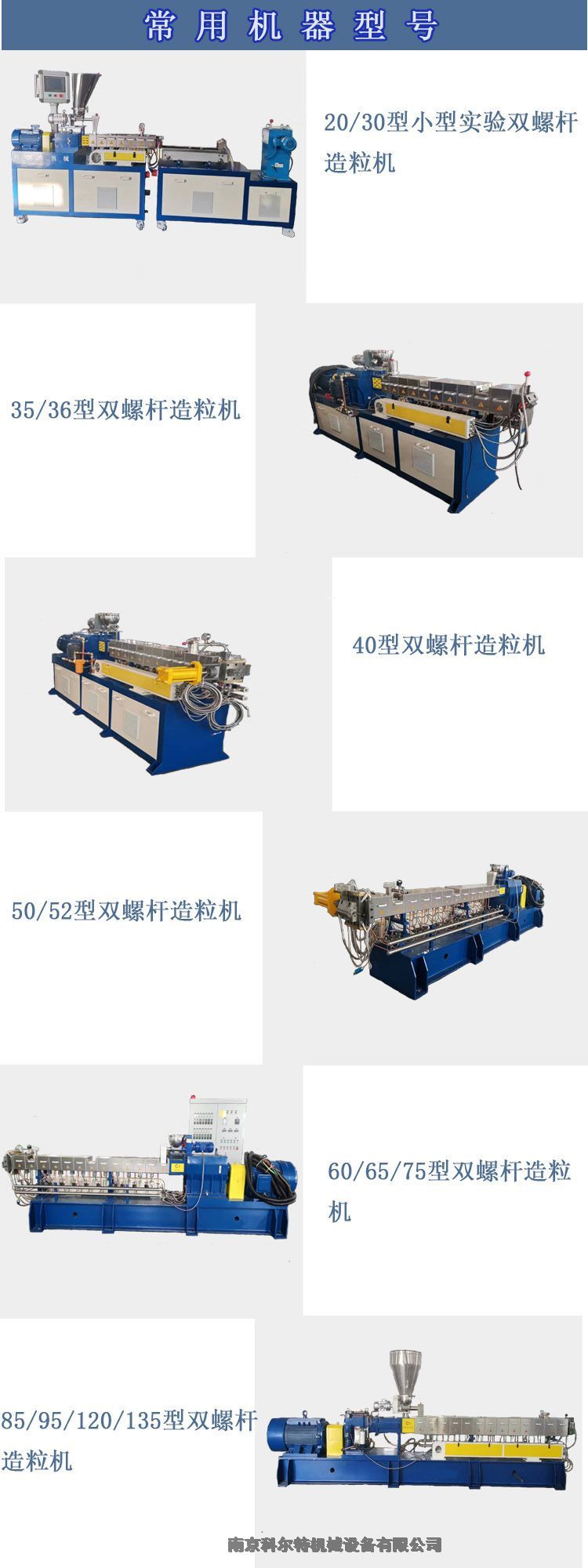 20双螺杆小型实验机, 30双螺杆挤出造粒机,36双螺杆挤出造粒机,35双螺杆挤出造粒机,50双螺杆挤出造粒机,52双螺杆挤出造粒机,65双螺杆挤出造粒机,75双螺杆挤出造粒机,85双螺杆挤出造粒机,95双螺杆挤出造粒机,120机双螺杆造粒机,135双螺杆挤出机