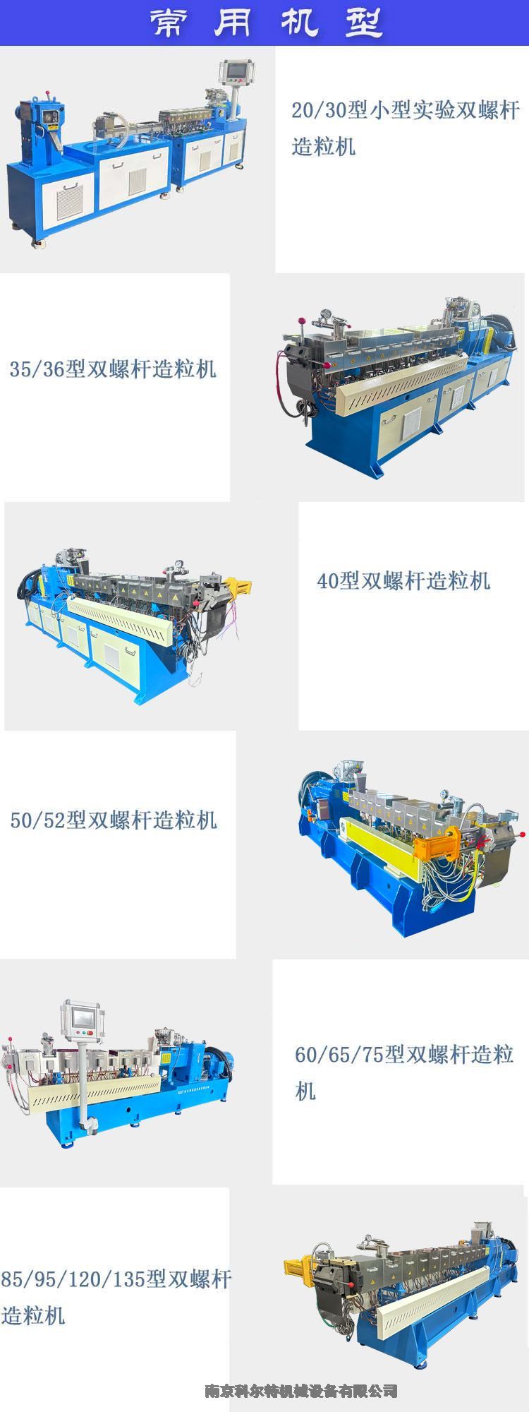 20双螺杆小型实验机, 30双螺杆挤出造粒机,36双螺杆挤出造粒机,35双螺杆挤出造粒机,50双螺杆挤出造粒机,52双螺杆挤出造粒机,65双螺杆挤出造粒机,75双螺杆挤出造粒机,85双螺杆挤出造粒机,95双螺杆挤出造粒机,120机双螺杆造粒机,135双螺杆挤出机