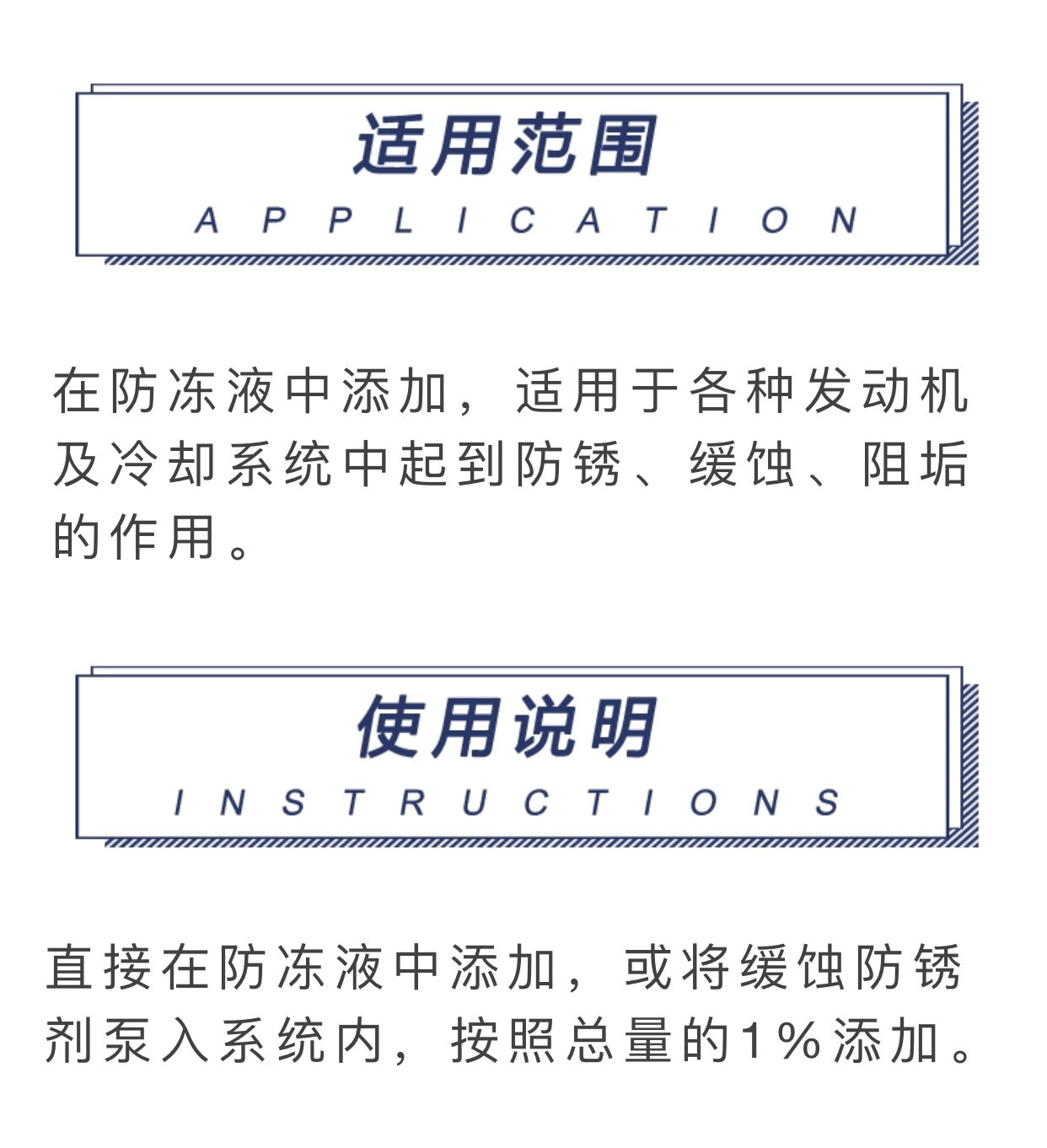 使用方法 | 直接在防冻液中添加,或将缓蚀防锈剂泵入系统内,按照总量的1%添加。 | ||