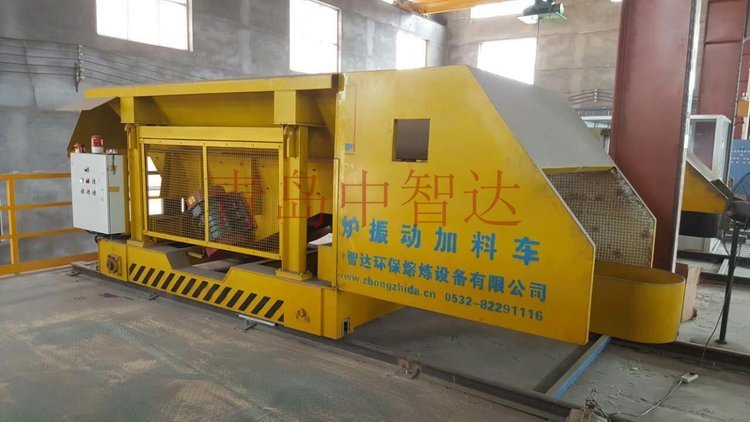 加料车设有四组吊轮(两主动、两从动制)悬挂在电炉上方的两根“工”字钢上且能横向移动给并列的电炉加料,两台以上电炉可共用一台加料车,一车两用(多用)投入较少,不占用电炉平台,适用于5吨以下老式结构电炉平台的改造使用。