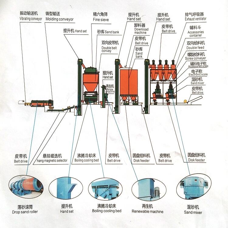 粘土砂线上的主要单机介绍:落砂滚筒、破碎机、磁选机、精细六角筛、沸腾冷却床、再生机、圆盘给料机、斗式提升机、皮带输送机、转子混砂机等。