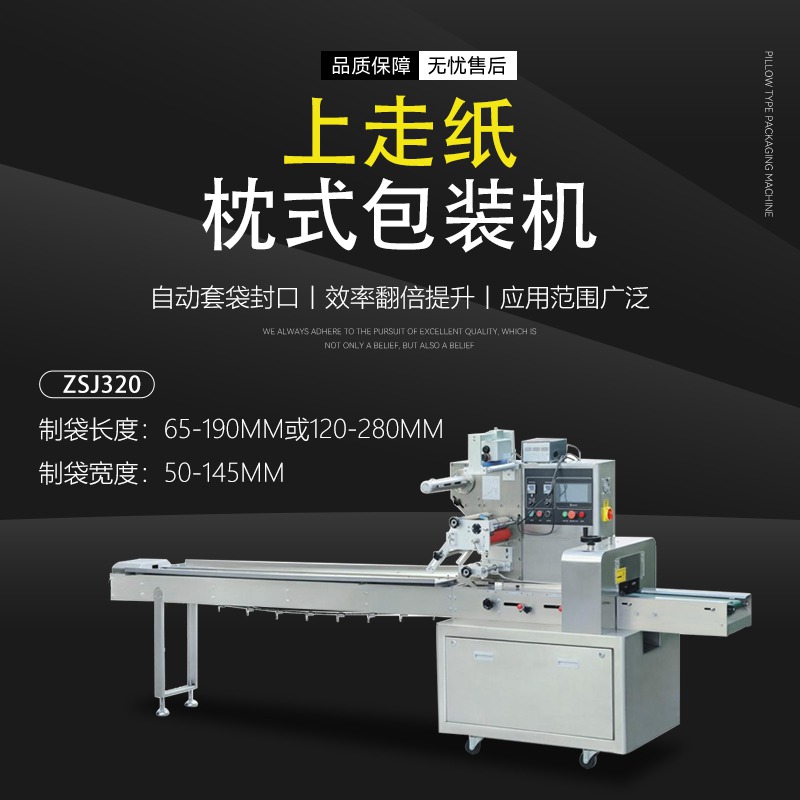 枕式包装机机械用途:本包装机是针对固型物的包装而设计的,用于包装产品,使产品增长其保质期,增加产品美观度的一种机械。适合于包装各类固态有规则的物体,如食品类的饼干、面包、月饼、糖果等,以及日用品、工业零件等,对于散状物或个体分离的物体,则须将被包物先置于盒内,或将之绑束成一体,使之形成一个整体后,才可在本机上包装,至于其它非固态的被包物亦须准此要领。