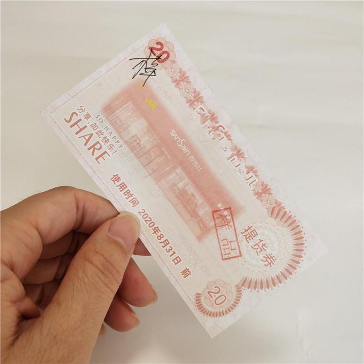 我公司印刷制作各种防伪礼金券、防伪代金券、防伪现金券、防伪提货券、防伪水票、防伪门票等防伪票券,我们制作的防伪礼金券等票券一般都是加入防伪的,我们可以免费为客户出设计稿,客户只需要告诉我们具体的尺寸和文字、图案内容和设计要求,我们做的防伪票券尺寸、数量、用纸、价格等都是根据客户要求确定的。