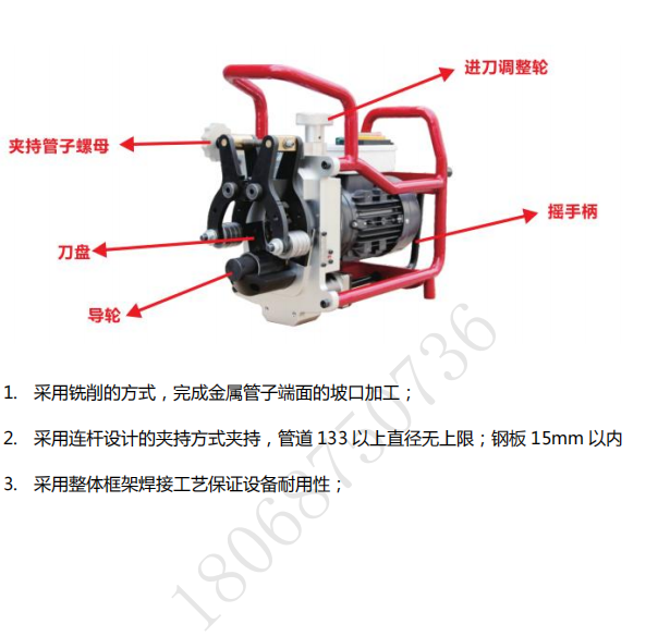 功能用途 | 加工管道最小直径为114MM,最大无上限;斜边最大15MM,同时还可以加工最大厚度15MM的板材。 | ||