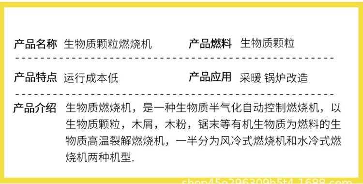 生物质颗粒燃烧机是一款半气化燃烧机,可以广泛应用于锅炉、压铸机、工业炉窑、焚烧炉、熔炼炉、厨房设备、干燥设备、食品烘干设备、熨烫设备、烤漆设备、公路筑路机械设备、工业退火炉、沥青加热设备等各种热能行业。产品规格:都配备进料调速器,可以调节进料快慢。