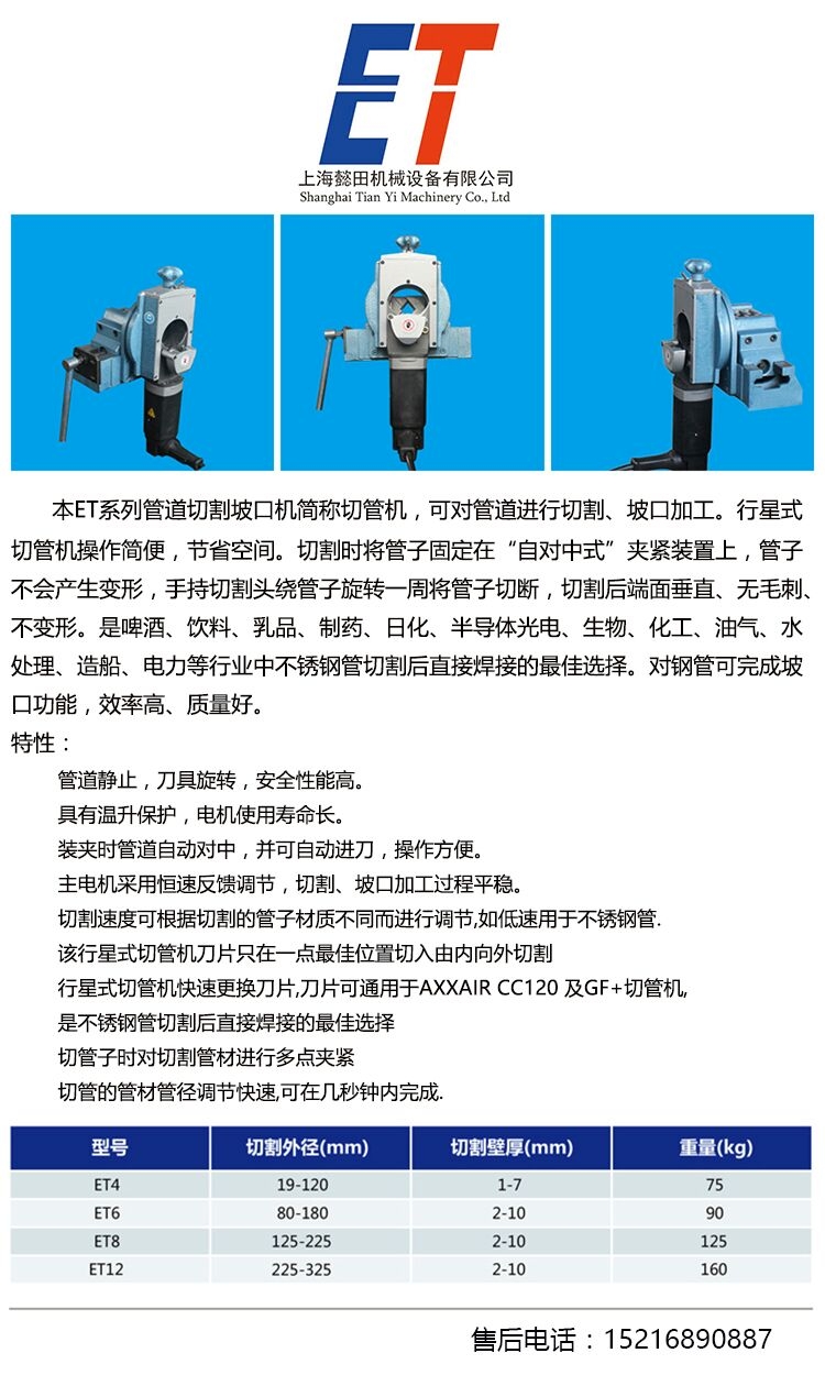 Company introduction:ET Mechanical Equipment CO.,ltd. found in APR 2016, is proud to produce the most popular orbital pipe cutters, steel pipe cutting machine in China.The company ha strong economic strength and ability of new product development, manufacture, design.And the productions are exported to Europe,North America,Southeast Asia,Middle Asia,Russia and so on.We insist on the theory that quality first and the users are supreme.At the same time,we notice the connect with customers,carefully listen to the customers' suggestion and attend on customers' need,we offer high quality machines with reasonable prices and service satisfactory,Welcome to ask.