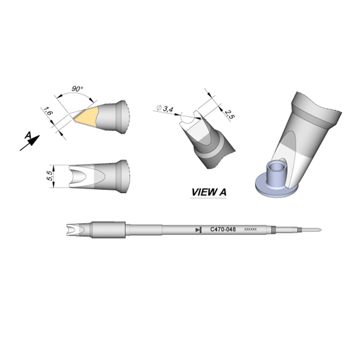 A 锡面宽度= 5.5 (0.216) B 内侧凹锡面 = ? 3.4 (? 0.134) C 斜度锡面 = 1.6 (0.063)